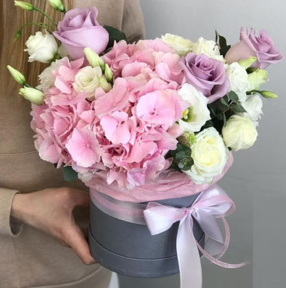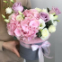 Шляпная коробка с гортензией, розами и лизуантусами | Купить в Жуковском