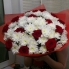 Пышный букет из красных роз и белых кустовых хризантем станет незабываемым подарком для любимой девушки.