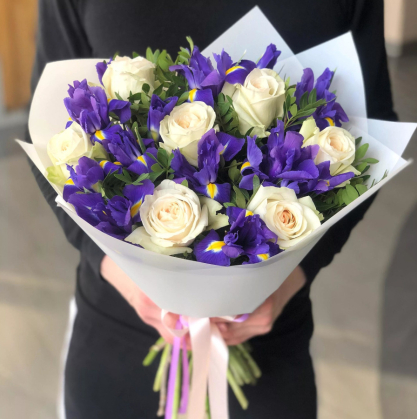Букет с ирисами и белыми розами
