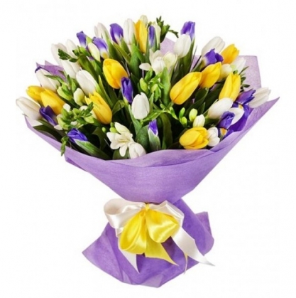 Букет "Три желания" из тюльпанов, ирисов и фрезии | Купить в Жуковском